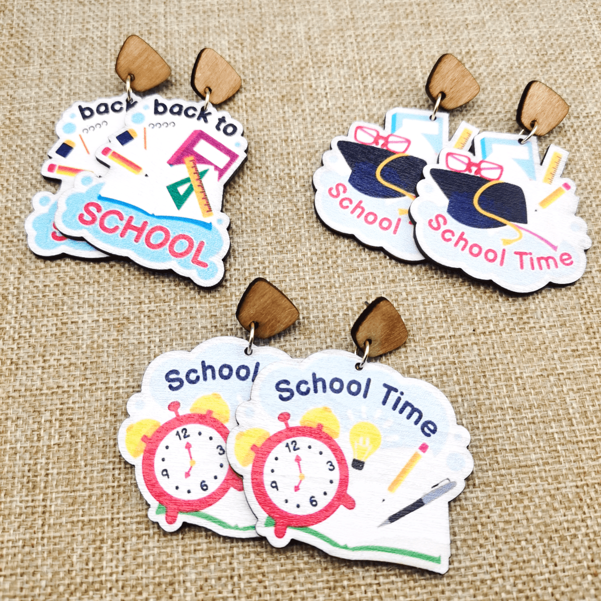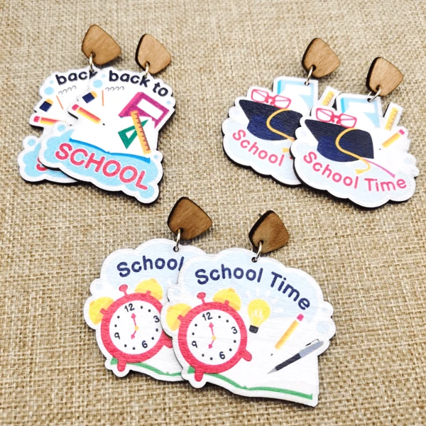 1pair 2024 Europe And America Back To School Single Sided Printed Wooden Drop Earrings For Campus Students Daily Simple Earrings