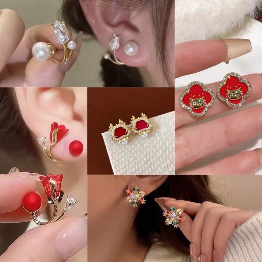 1pair 2024 New Year'S Alloy Earrings Decorated With Rhinestones, Vintage & Versatile Design For Women & Girls, Suitable For Festivals And Daily Wear