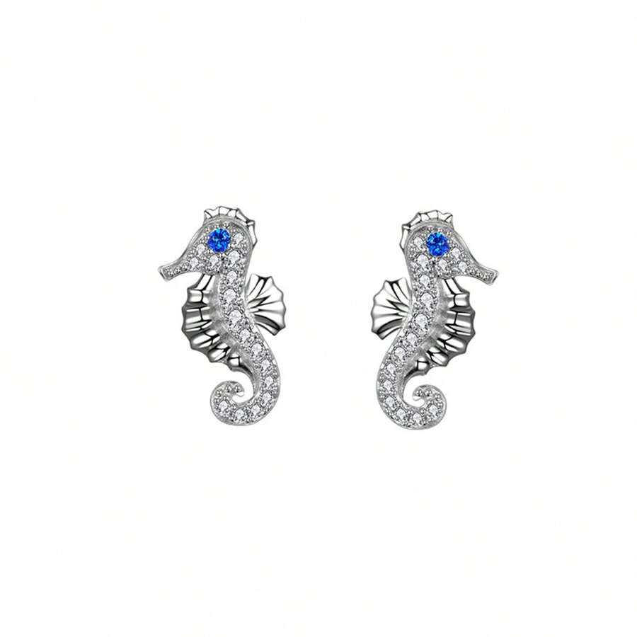 1pair 925 Sterling Silver Seahorse Design Stud Earrings As Women'S Accessory For Daily Wear Or Gifts