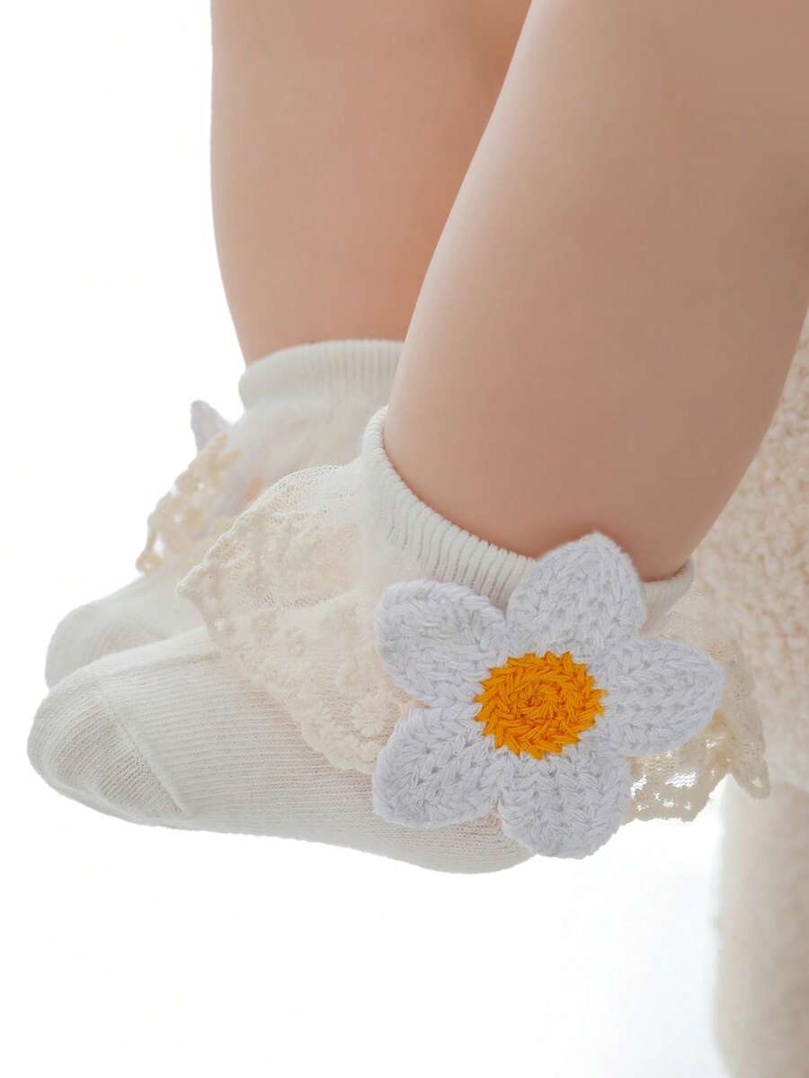 1pair Baby Girls Lace Trim & Flower Decor Hollow Out Socks