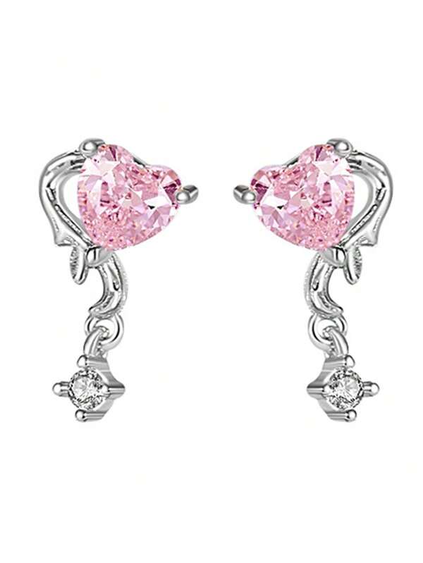1pair Beautiful 925 Sterling Silver Thorn Heart Shape Pink Earrings, Ins Popular Style Suitable For Ladies' Daily Wear