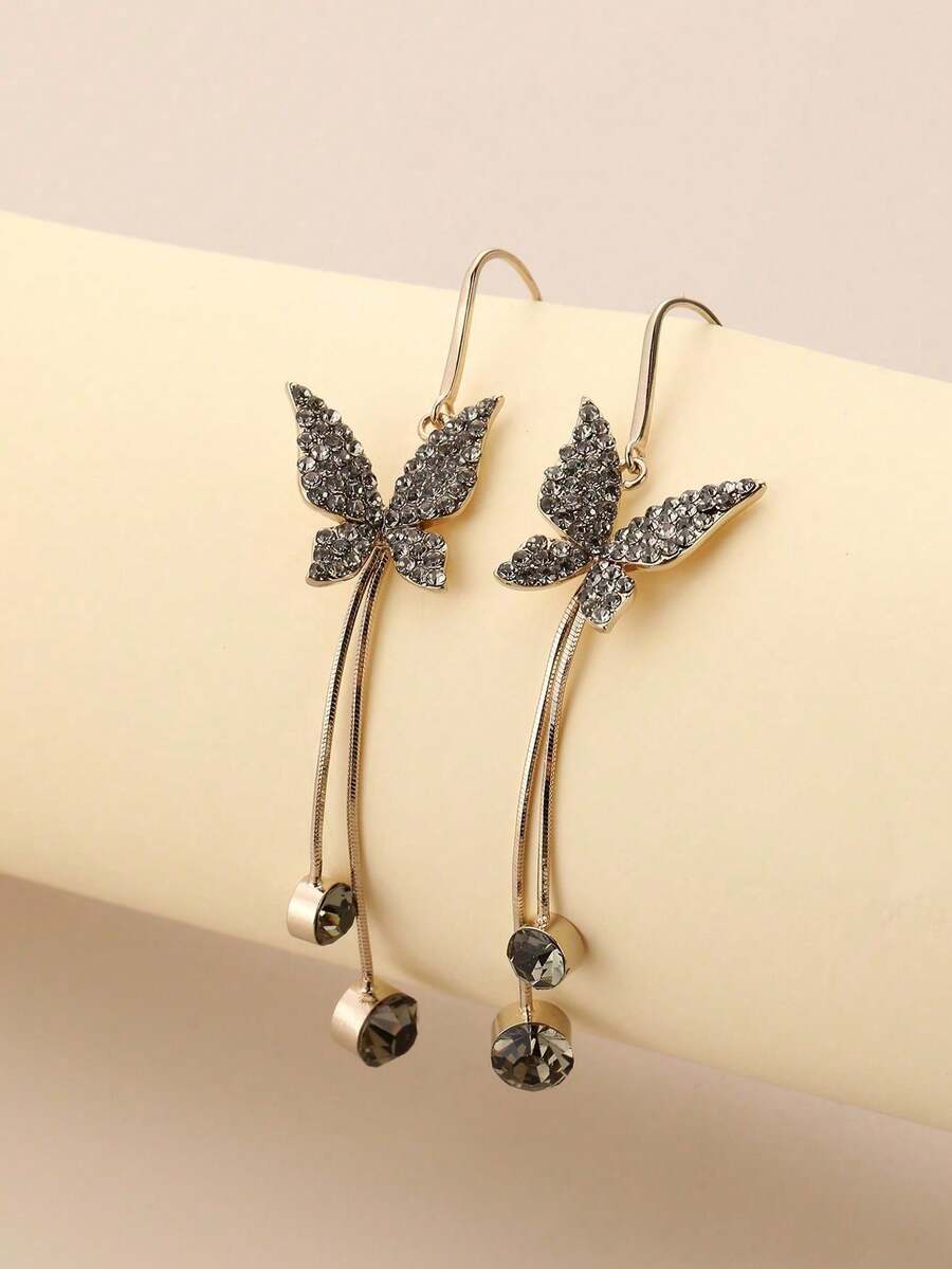 1pair Butterfly Design Tassel Earrings Full Rhinestone Stud Earrings, A Gift For Your Lover