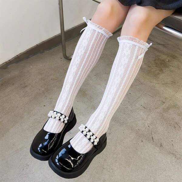 1pair Children'S Bowknot Lace Trim Long Tube Socks, Lolita Style For Girls