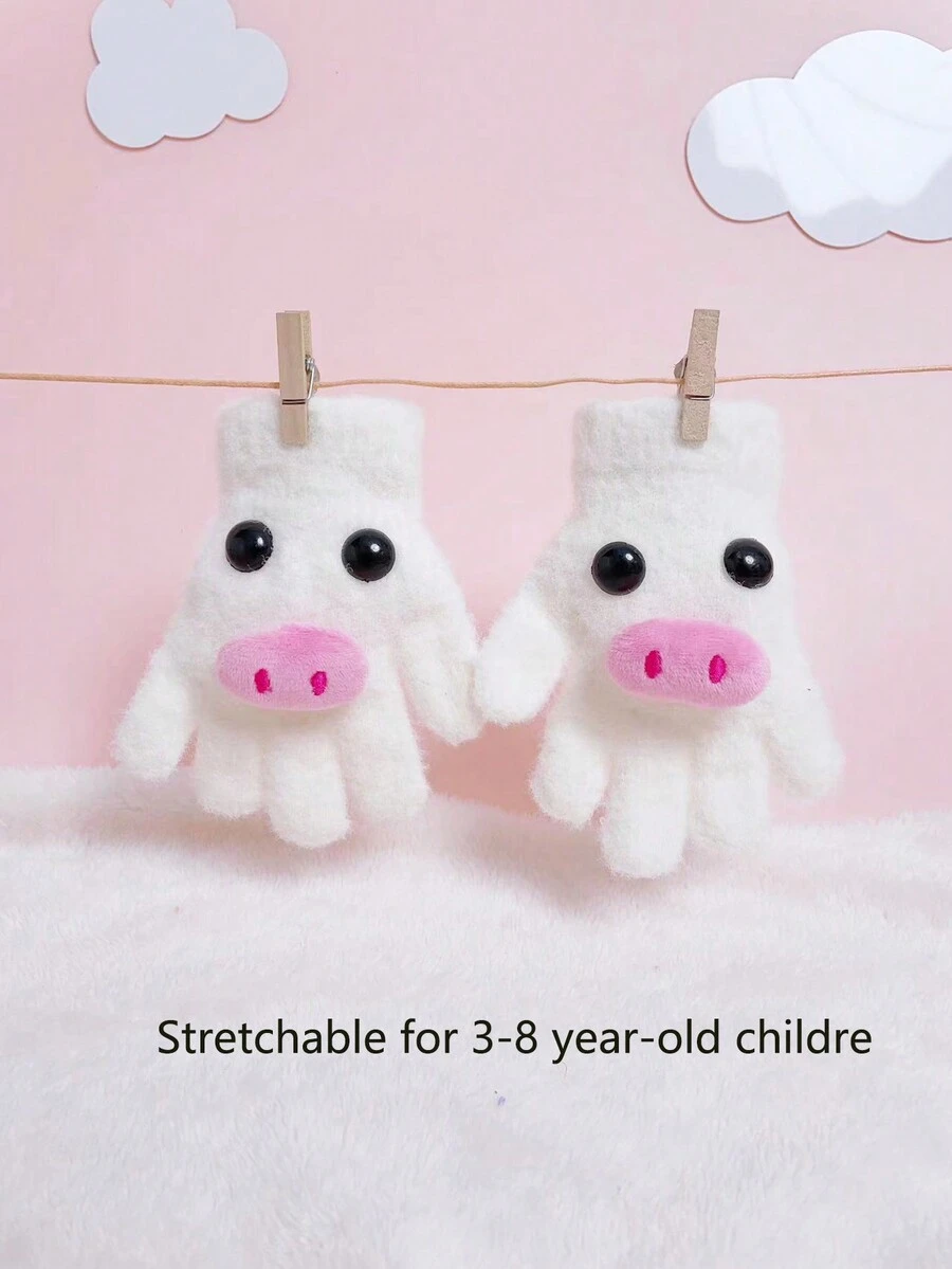 1pair Children'S Cartoon Baby Winter Warm Mittens, Pig/Bear Patterned Fleece Infants Gloves, Soft And Comfortable Kids Gloves For Winter, White