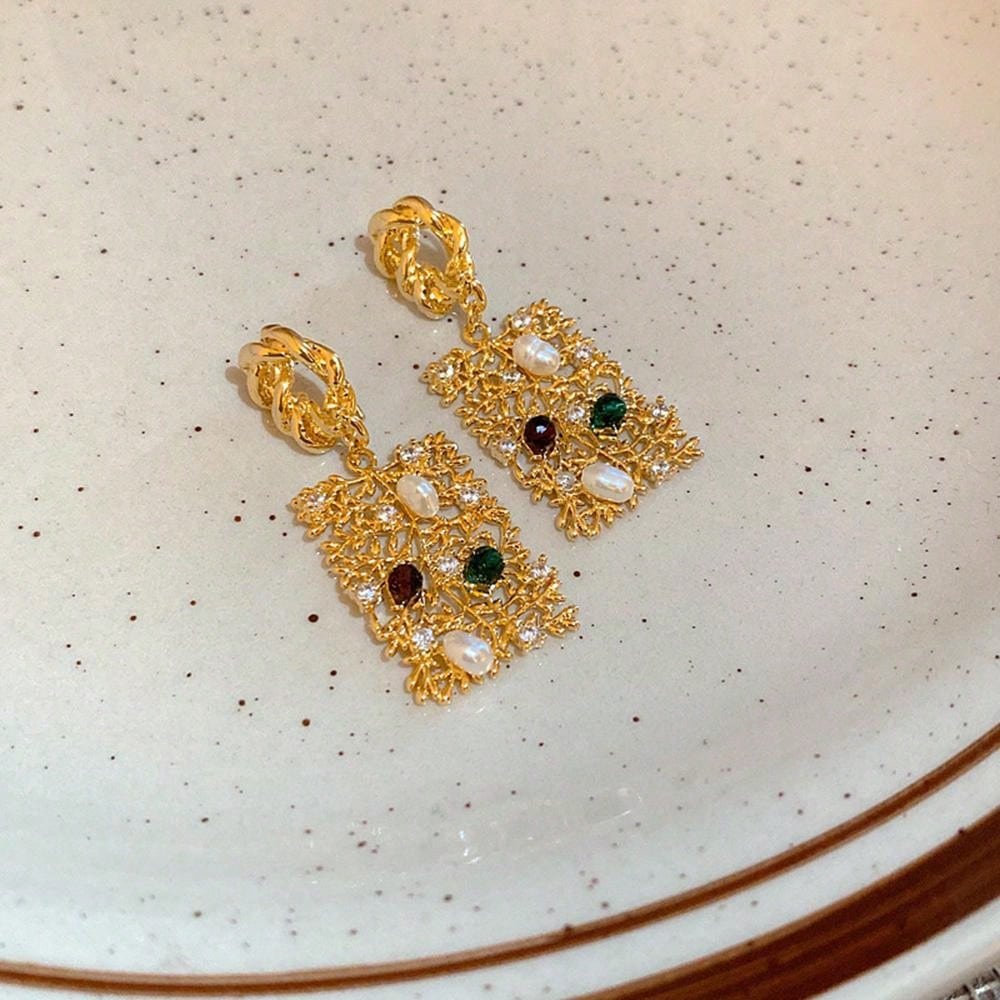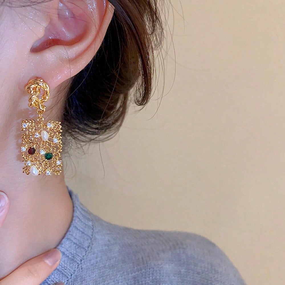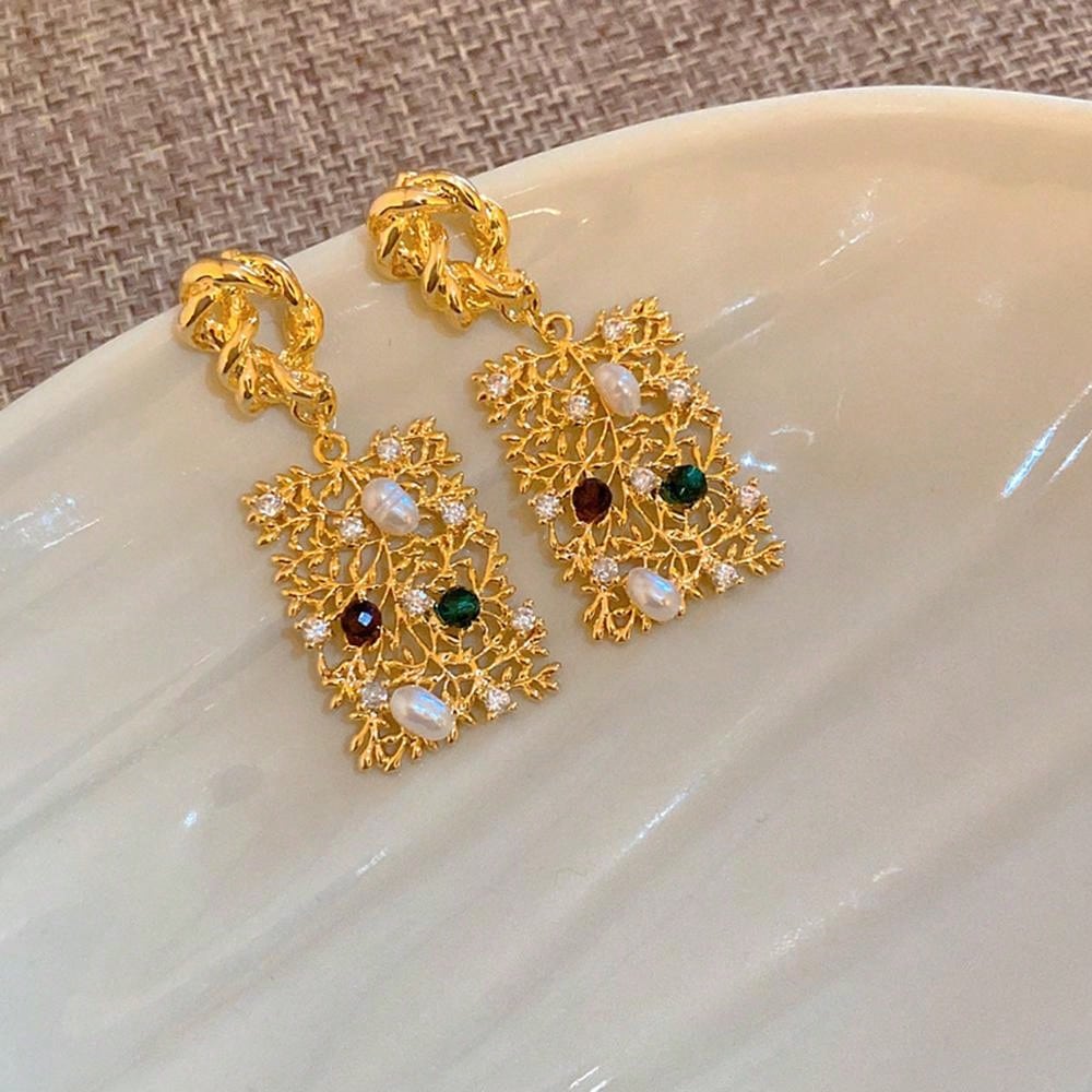 1pair Copper Inlaid Faux Pearl Exaggerated Branch & Leaf Design Earrings Suitable For Women's Daily Wear