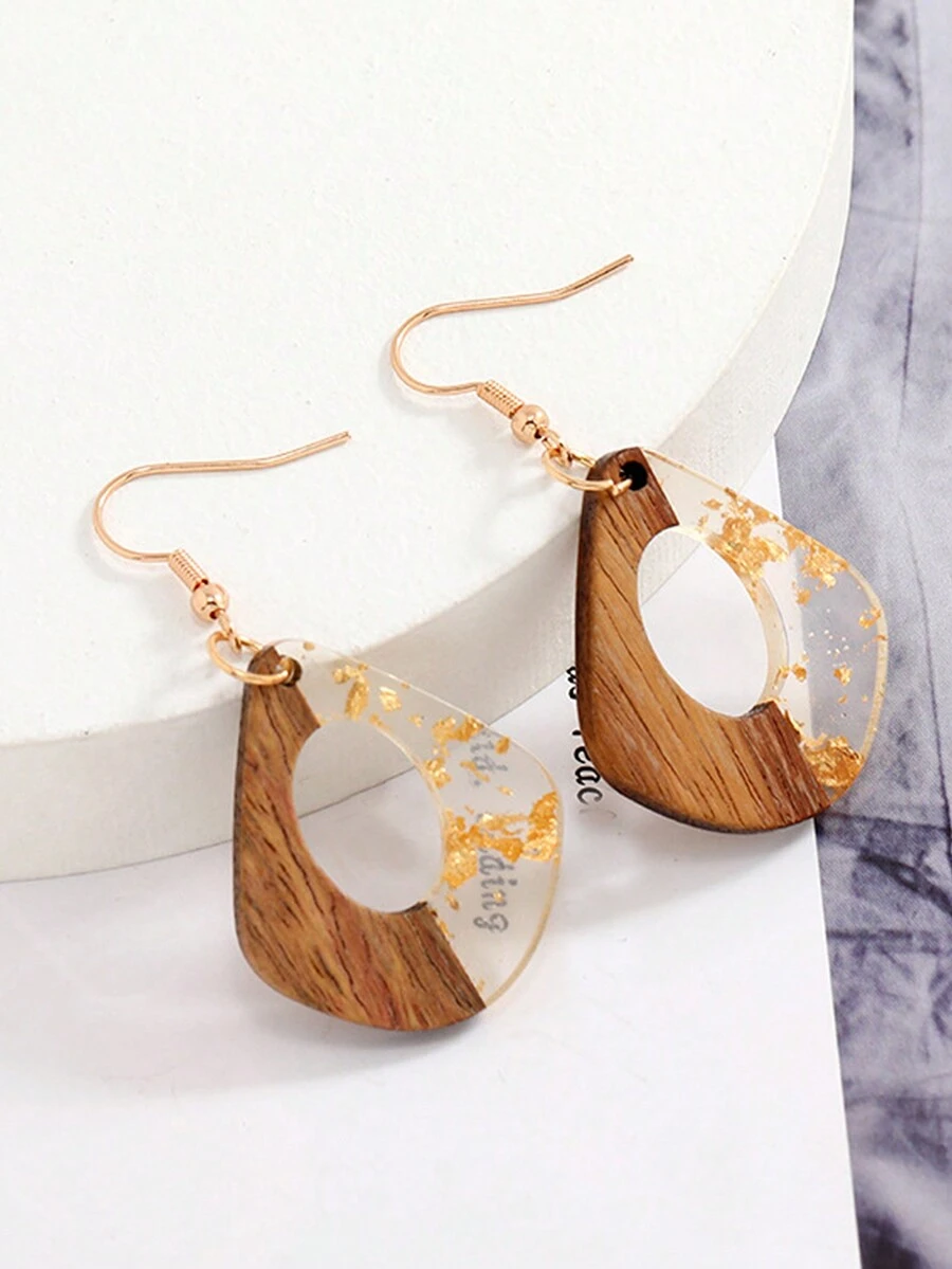 1pair Creative Wood & Polyresin Mosaic Design Minimalist Earrings, Suitable For Women