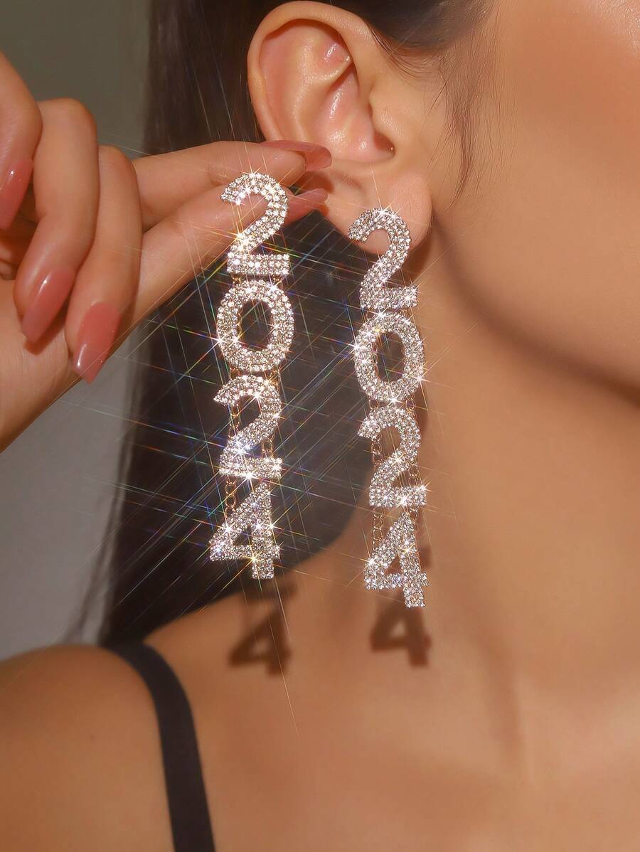 1pair Cross-border Sparkling Diamond-covered Year Number Earrings, Versatile Trendy 2024 Charm Ear Jewelry
