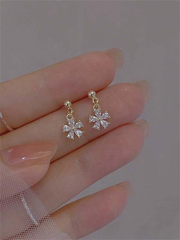1pair Cubic Zirconia Square Stone, Gold-Plated Brass Flower Shape Cz Stone Dangle Earrings