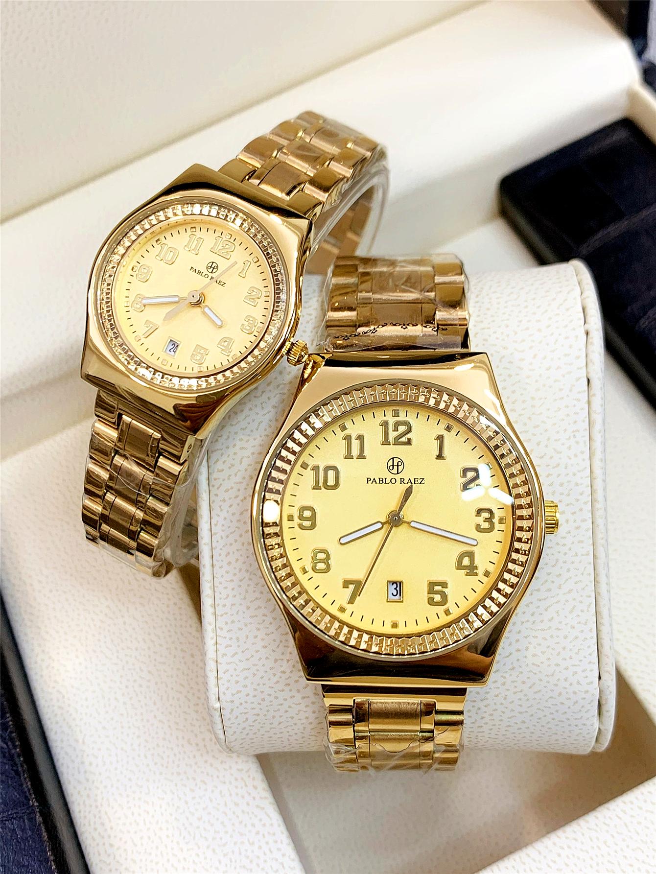 1pair Elegant Couple Watch With 18k Gold-Tone Stainless Steel Case, Ipg Technology Heavy Band, Luxury Numerical Scale, Butterfly Clasp, Waterproof, Automatic Calendar Quartz Watch, Suitable For Gift, Daily Life, Work, High-End Gift For Lover, Friend, Family