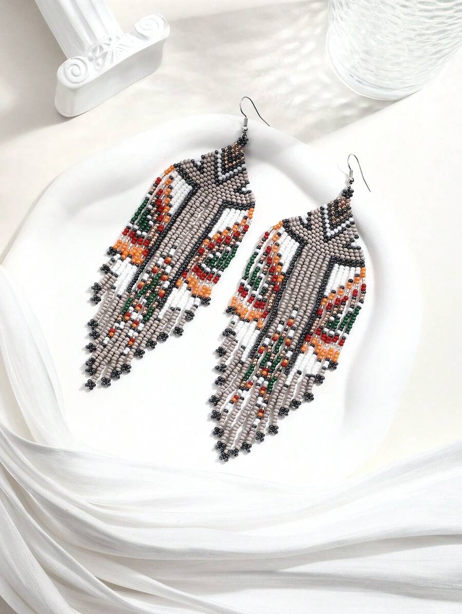 1pair European And American Bohemian Style Beige Glass Beads Fringed Pendant Earrings Suitable For Women'S Daily Wear