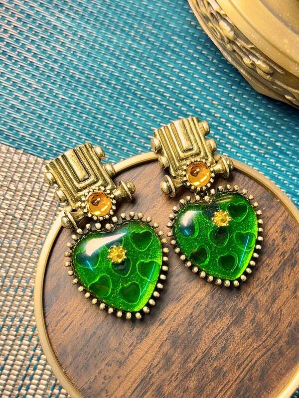 1pair European And American Retro Elegant Lady Design Plated Gold Antique Green Stone Heart Shape Earrings Suitable For Women'S Everyday/Festival Wear, Great As Mother'S/Friend'S Gift And Jewelry