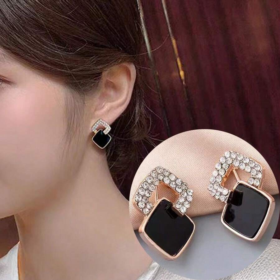 1pair Fashionable Alloy Rhinestone Square Shaped Black Mosquito Coil Plate Clip On Earrings, Simple & Unique Style, Winter, Versatile Ear Jewelry For Women'S Daily Wear Without Piercing
