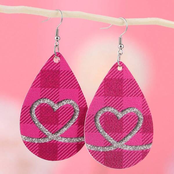 1pair Fashionable Creative Double-Sided Pu Leather Checkered Heart & Water Drop Decor Dangle Earrings For Women, Suitable For Daily Wear Or Evening Accessories, As A Valentine's Day Gift For Girlfriend