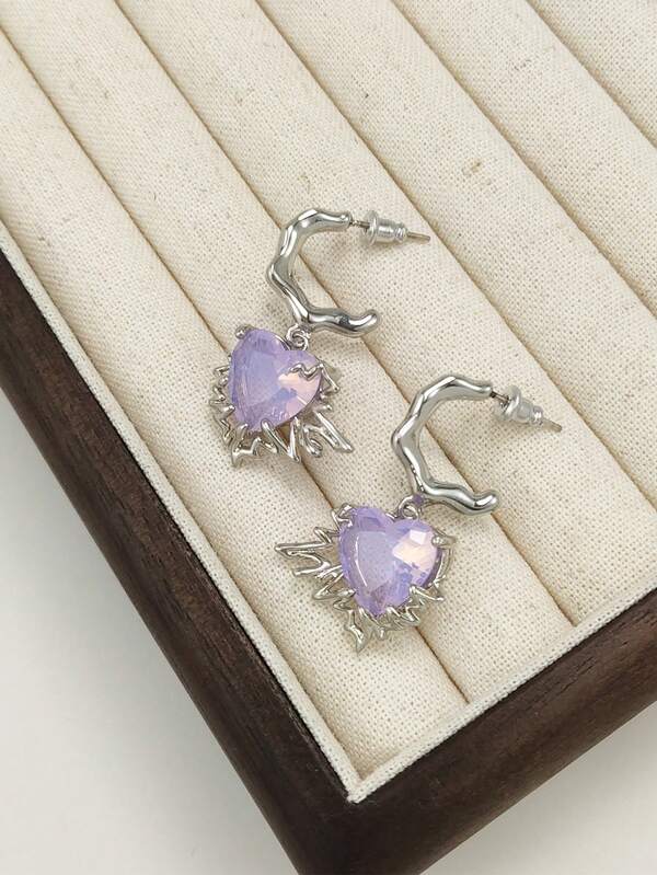 1pair Fashionable Electric Current Design Heart Shaped Gemstone Inlaid Dangle Earring Suitable For Women'S Everyday Wear