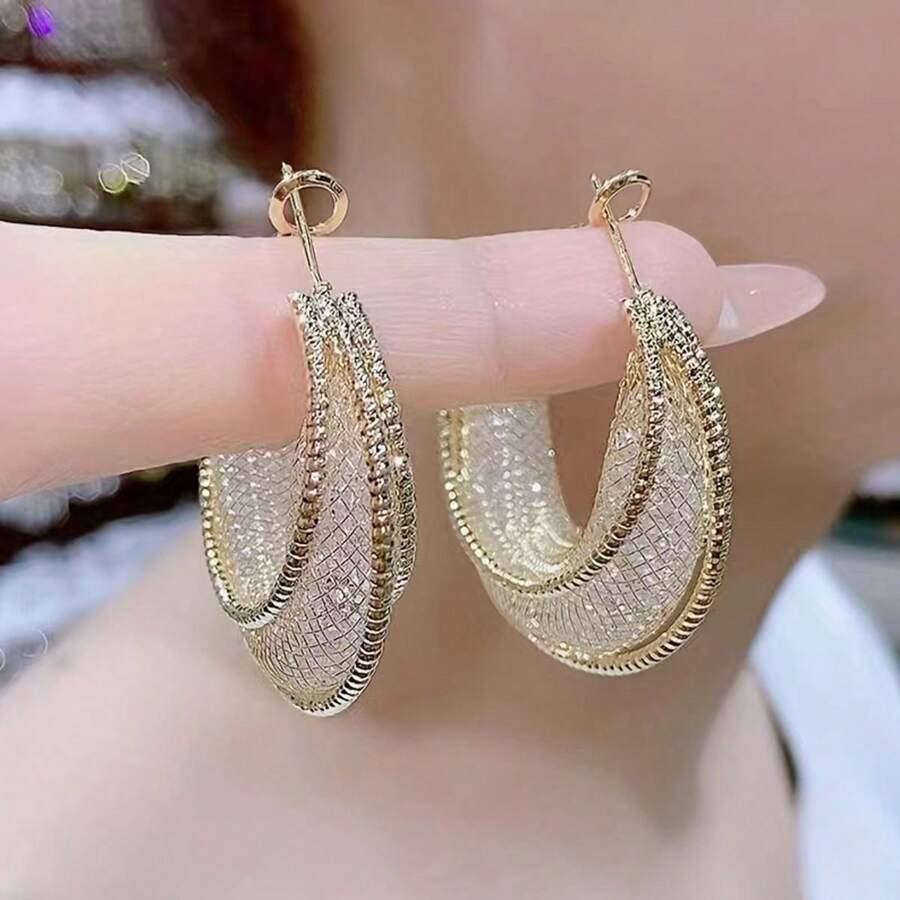 1pair Fashionable Luxury Gold Wire Mesh & Rhinestone Circle Earrings With Unique Design Sense For Women Daily Wear