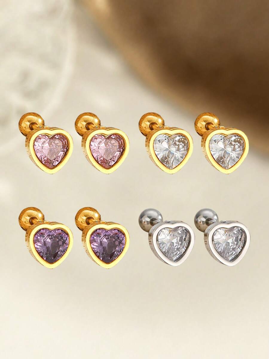 1pair Fashionable Simple Stainless Steel Heart Shaped Cubic Zirconia Decor Stud Earrings For Girls Sweet Party Jewelry For Children Birthday Gift