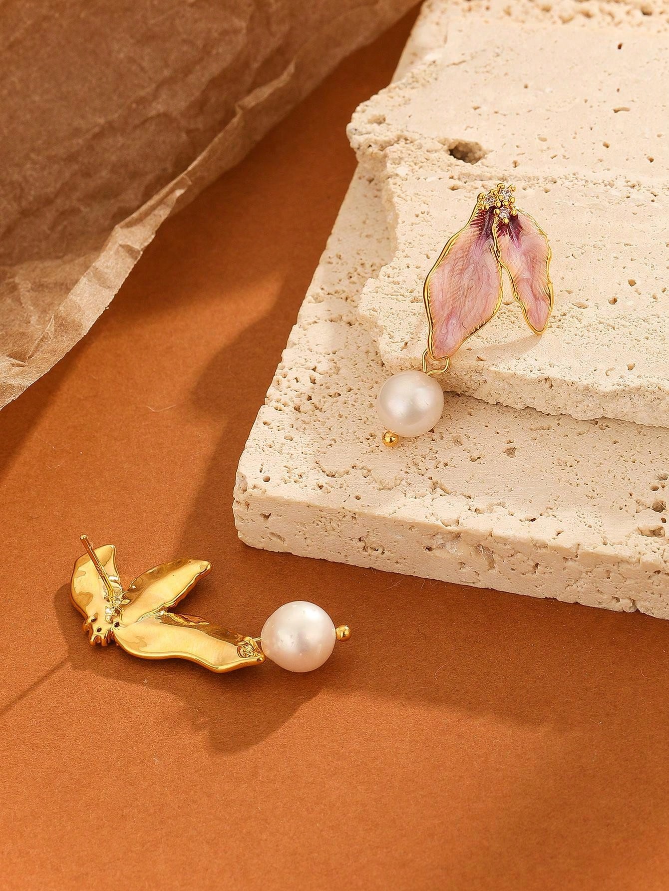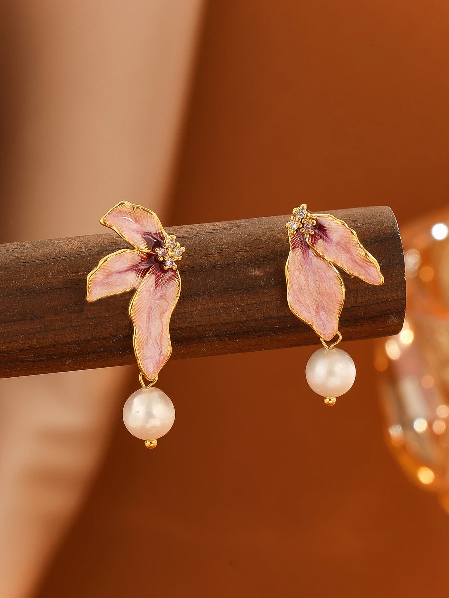 1pair French Style Natural Pearl & Enamel & Resin Drop Earrings With Half Flower Design, Perfect For Holiday Party