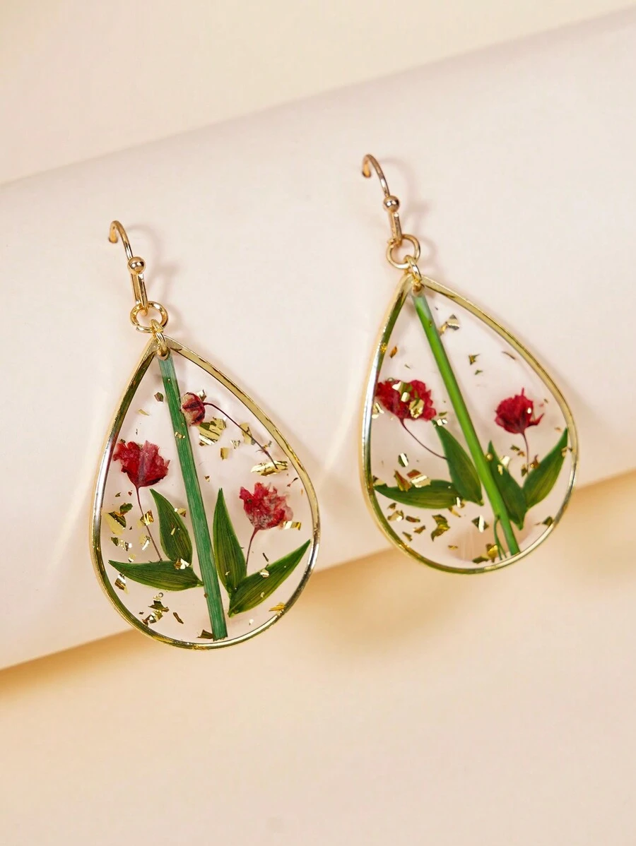 1pair Fresh Lovely & Fashionable Water Drop Shaped Real Dried Flower & Bamboo Leaf & Resin Flower Earrings For Women