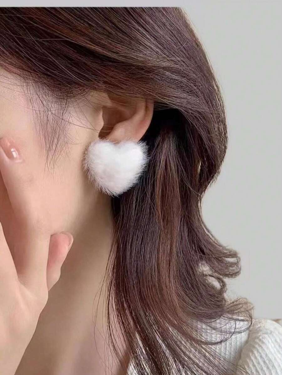 ROMWE Kawaii 1pair Heart Shaped Furry Decor Stud Earrings