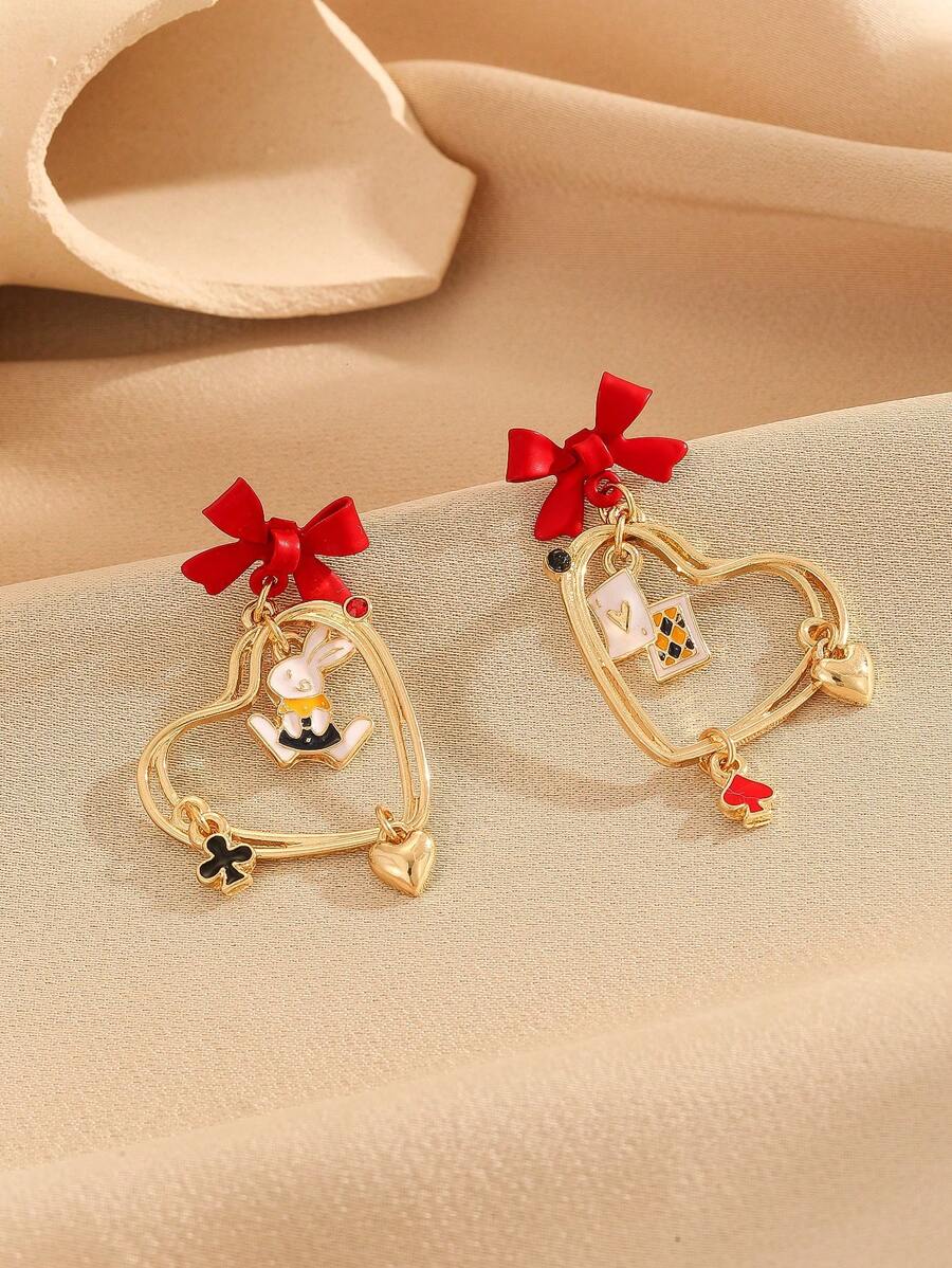 1pair Hollow Out Heart & Red Bowknot Shaped Stud Earrings, Suitable For Daily Wear, New Year & Valentine's Day Parties