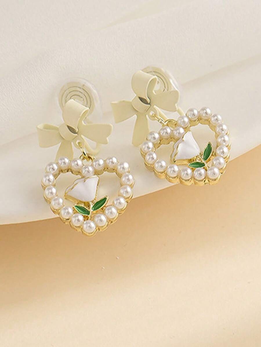 1pair Japanese & Korean Style White Bow & Heart Shaped Romantic Earrings, Imitation Pearl Clip-On Earrings Suitable For Girls Without Ear Piercings