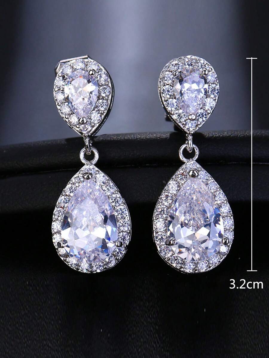 1pair Korean Style Bridal Classic Water Drop Shape Zirconia Earrings For Women, Aaa Zirconia Inlayed With Micro-zirconia Eardrop, Suitable For Non-pierced Ears