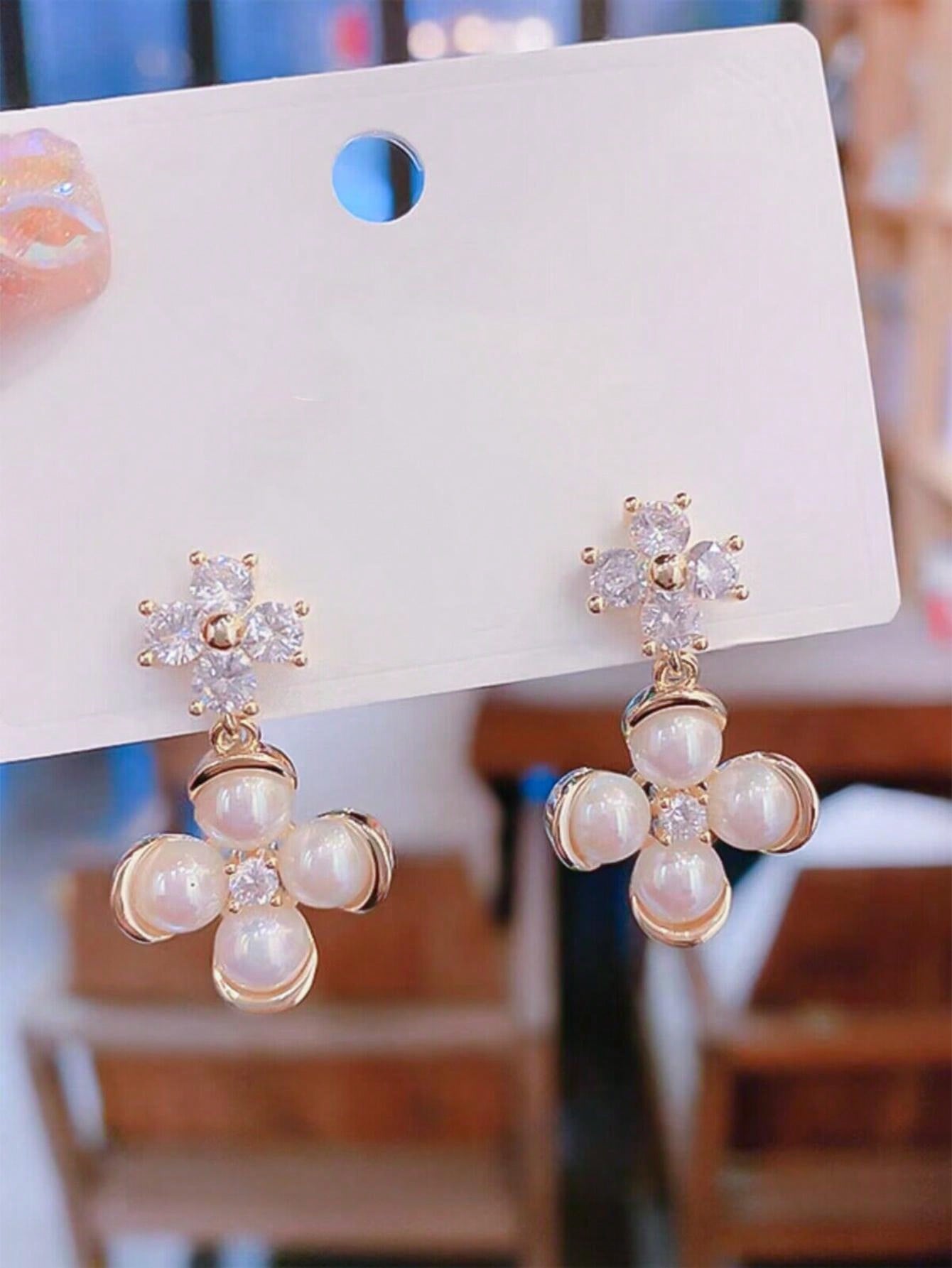 1pair Pearls & Rhinestone Clover & Flower Shaped Personality Design Elegant Earrings Luxury Women'S Jewelry