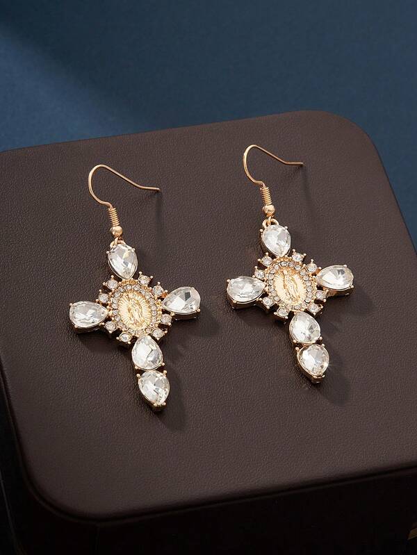 1pair Punk Style Cross Shaped Pendant Earrings, Women's Light Luxury Earrings With Zirconia & Virgin Mary Designs, Suitable For Daily Wear