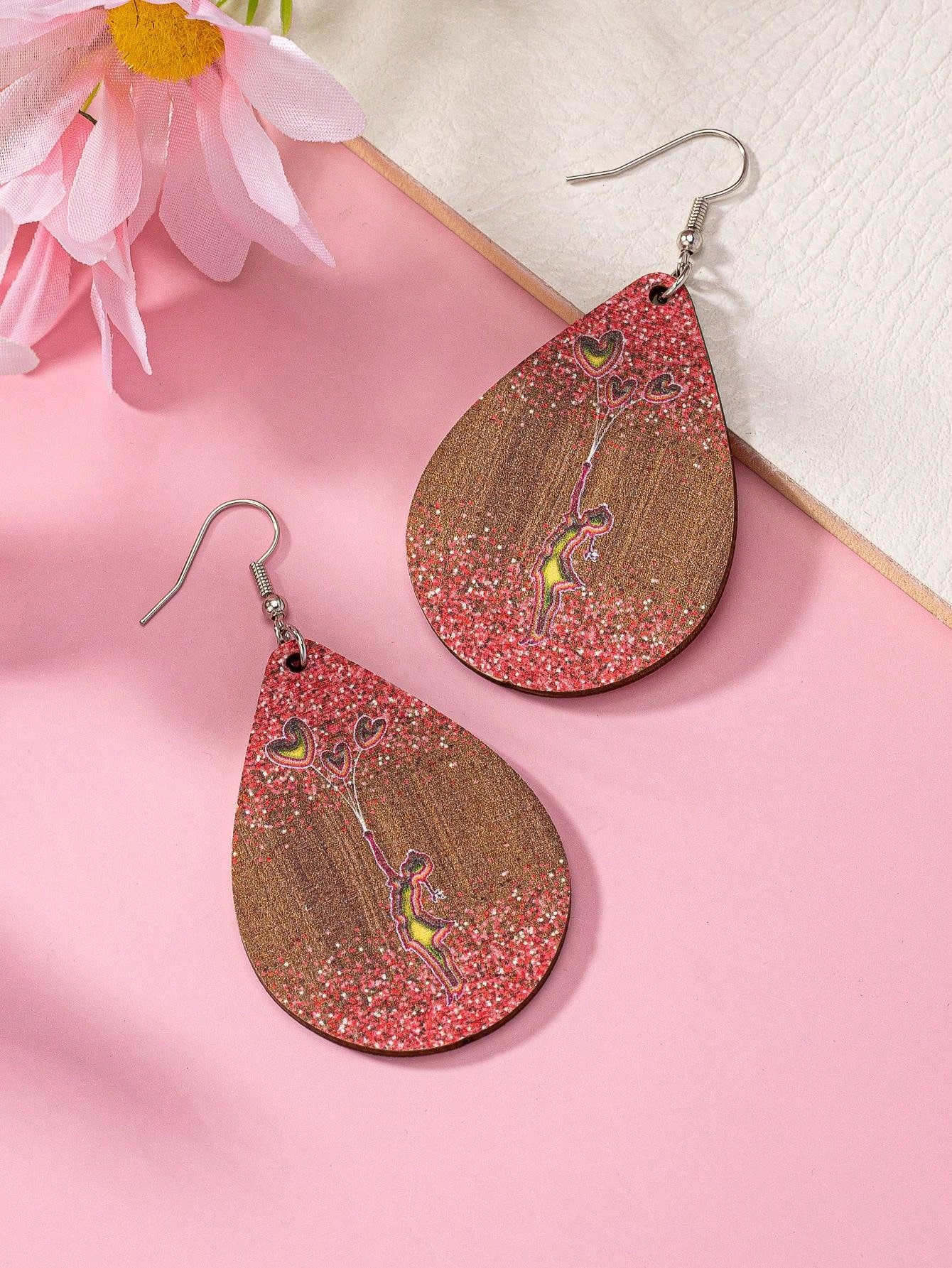 1pair Romantic Valentine'S Day Pink Envelope, Heart Balloon, Oxhead, Teardrop Shaped Wooden Earrings For Women With Painted Prints