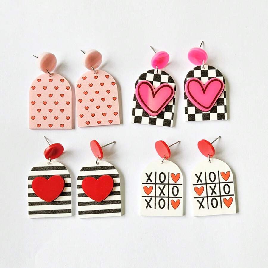 1pair Simple European & American Style Exaggerated Cute Arylic Dangle Earrings With Plaid, Stripe, Pink Heart And Xoxo Print For Valentine'S Day, Fall/Winter, Christmas, Festival And Other Occasions