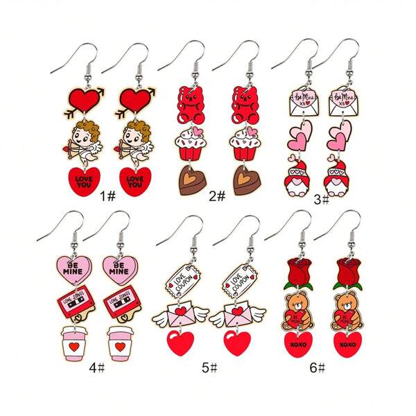 1pair Simple European And American Acrylic Statement Earrings, 2024 Valentine'S Day Pink Heart & Coffee Cup & Cupid & Chocolate Cake Dangle Earrings For Women, Autumn/Winter, Holiday Gift, Valentine'S Day Decoration