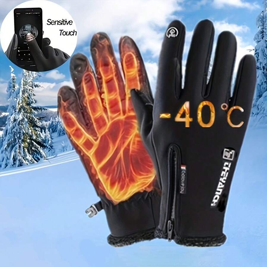 1pair Random Style Black Unisex Touch Screen Gloves With Zipper For Riding, Outdoor Sports, Plus Velvet Lining For Winter Warmth & Non-Slip Protection
