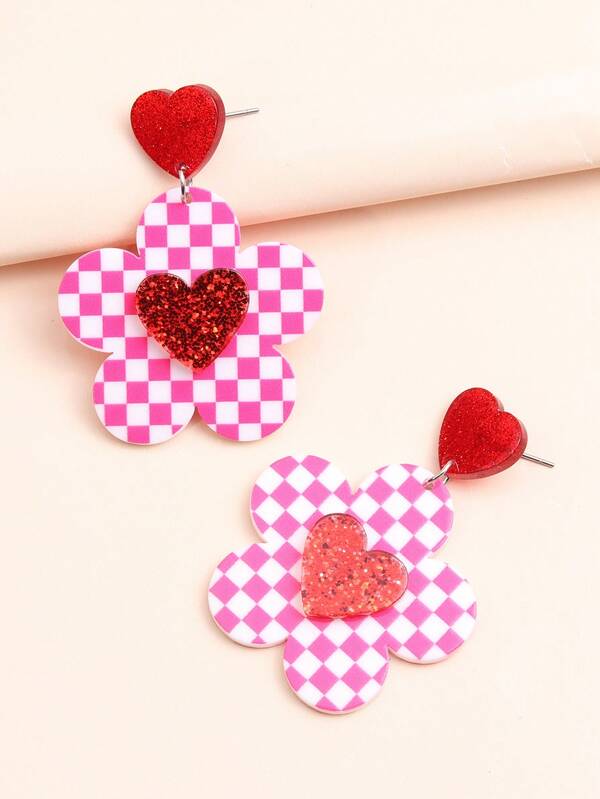 1pair Valentine's Day Plaid & Flower & Heart Design Earrings For Women