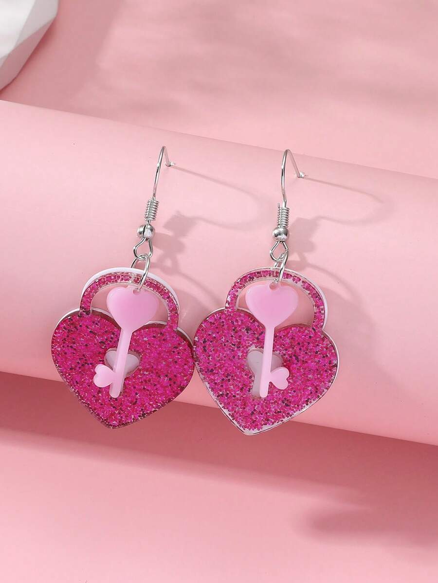 1pair Valentine'S Day Sweetheart Glitter Heart Lock & Key Acrylic Earrings