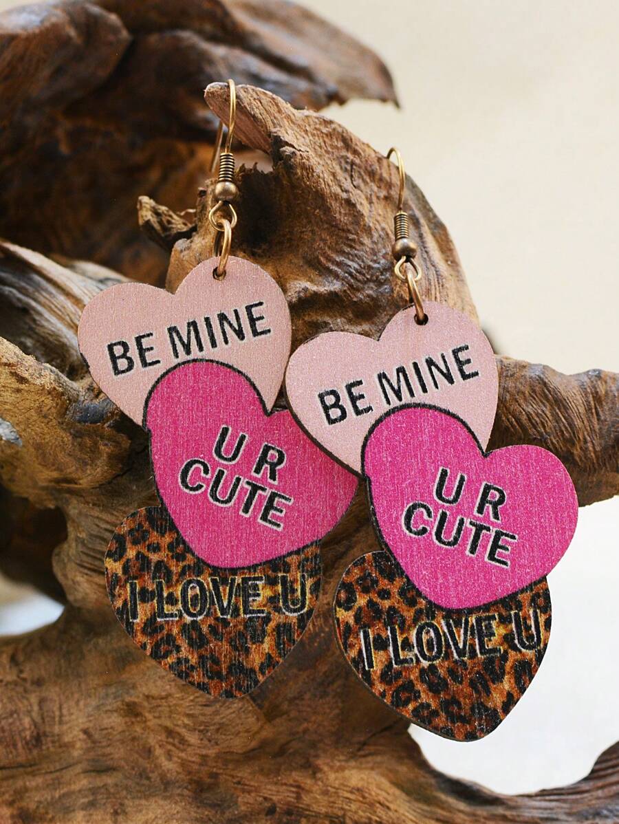 1pair Valentine's Day Wooden Printed Love Ear Studs & Heart-Shaped Alphabet Ear Studs & Be Mine Alphabet Ear Studs & Leopard Print Ear Studs