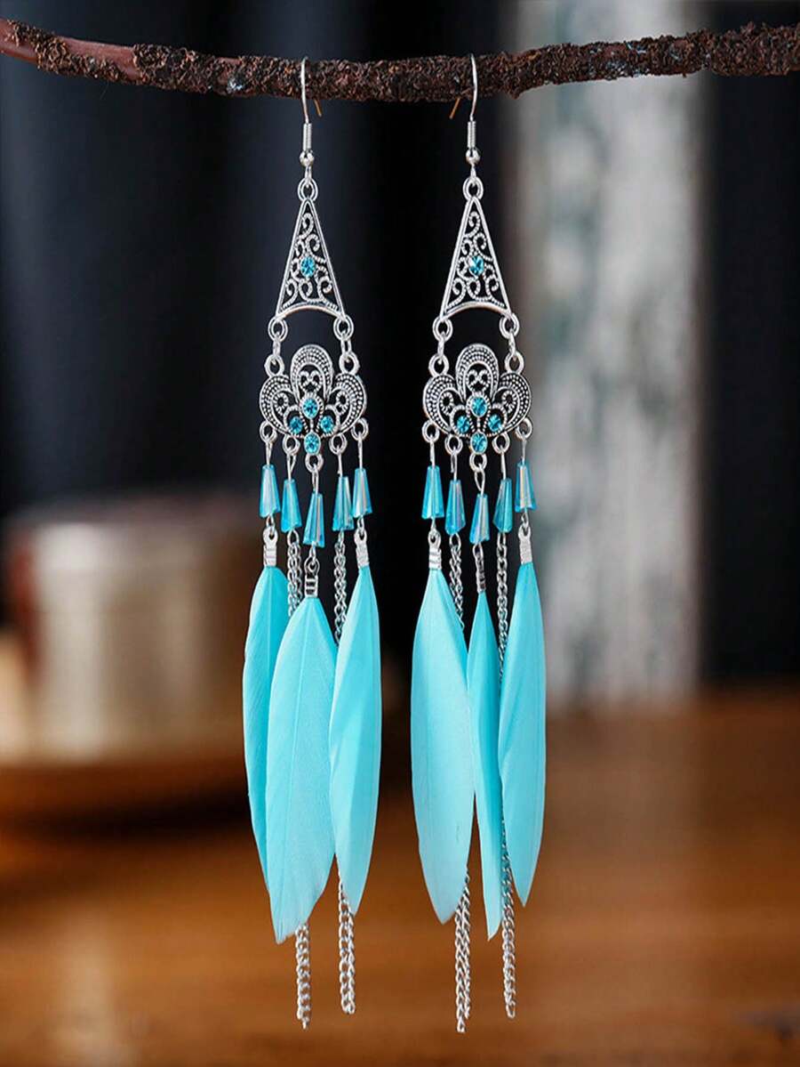 1pair Vintage Long Feather Decor Women'S Earrings