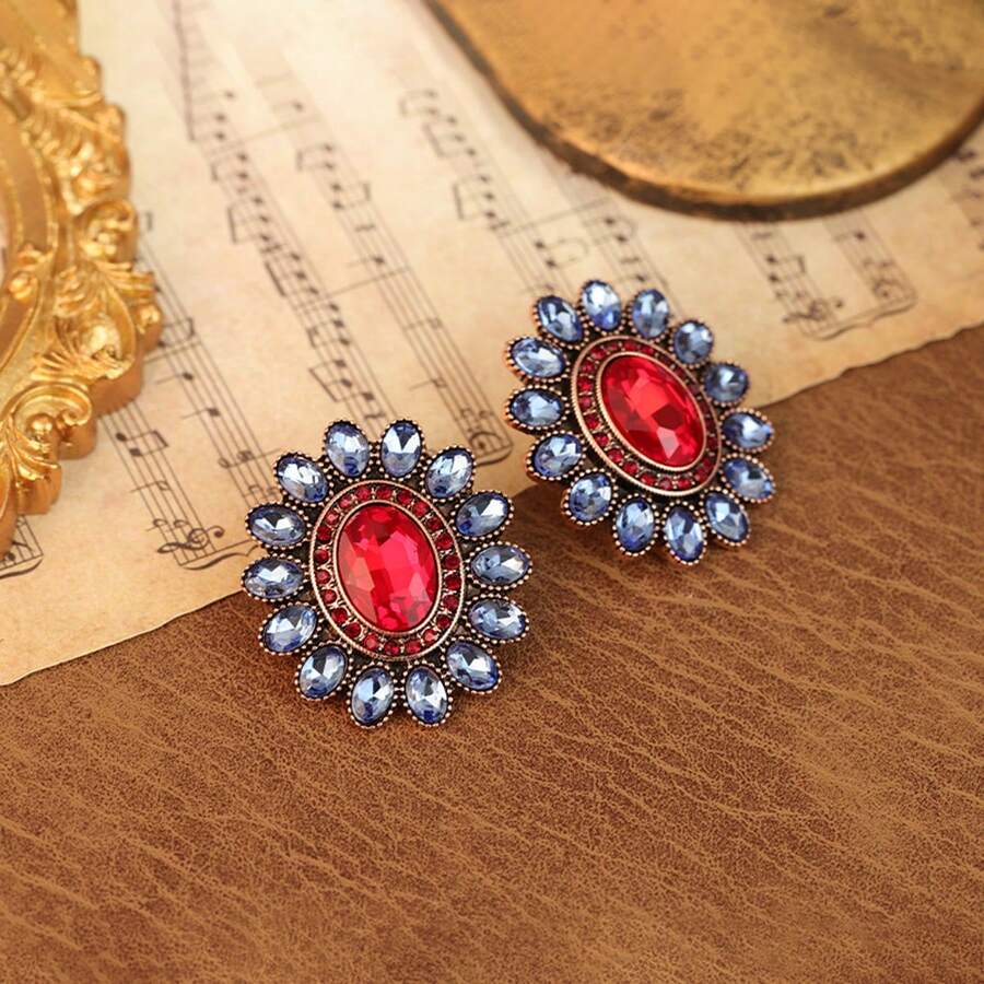 1pair Vintage Palace Style Oval Shaped Luxury Rhinestone Embedded Unique Ear Accessories