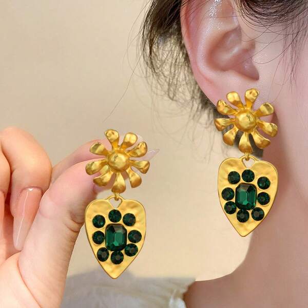 1pair Vintage Retro Crinkled Texture Floral Zinc Alloy Earrings With Diamond Embellishment
