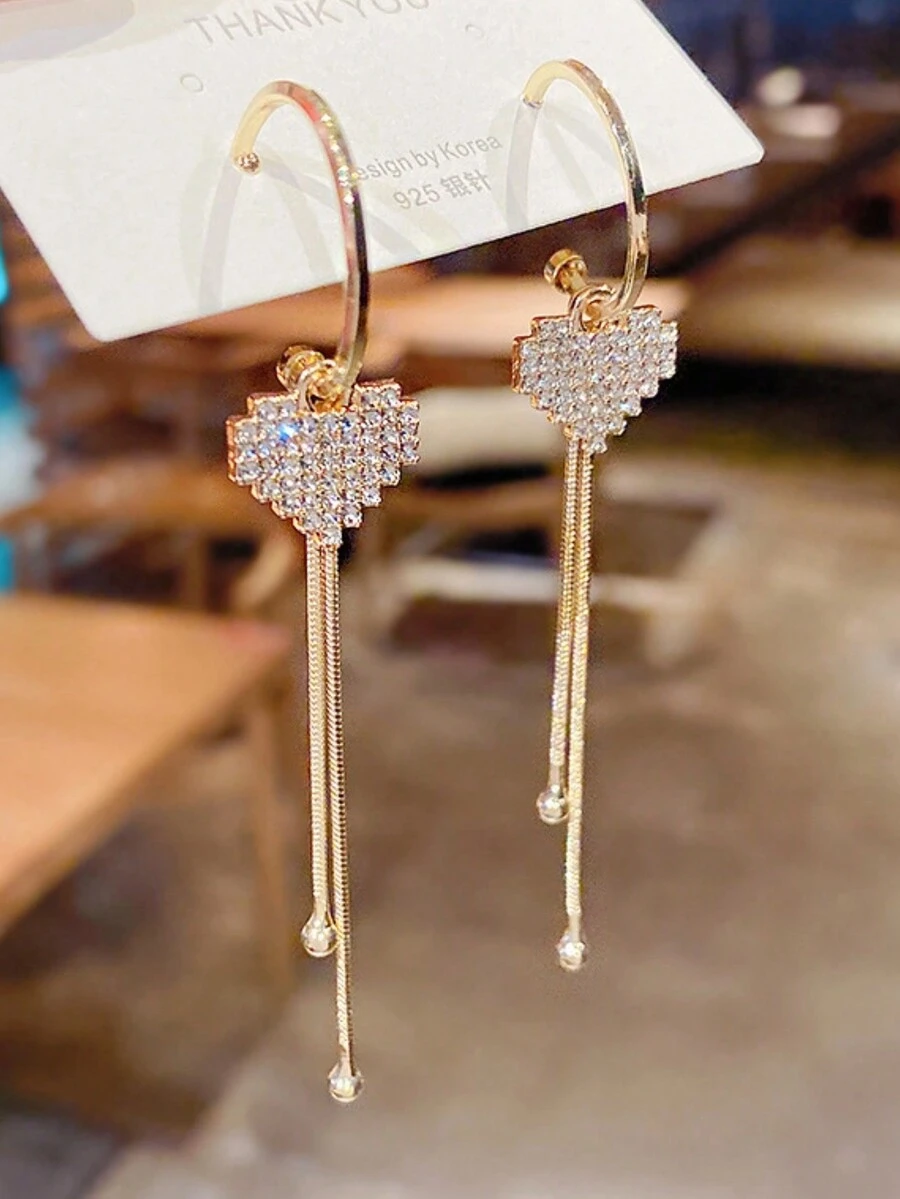 1pair Vintage Sweet Ins Style Rhinestone Heart & Tassel Pendant Dangle Earrings, Unique Design For Party, Dance, Daily Wear