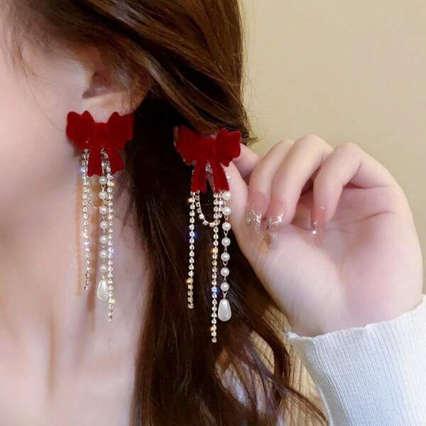1pair Wine Red Velvet Bowknot Pearl Tassel Dangle Earrings With Silver Needle, Fashionable Elegant Long Lady Ear Jewelry