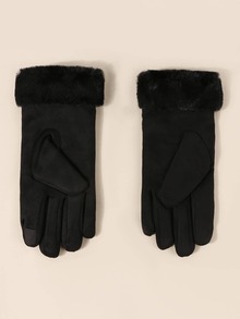 1pair Winter Warm Solid Color Plush Faux Suede Gloves, Simple Style With PU Leather Label, For Men And Women Couples, Daily Outdoor Warm