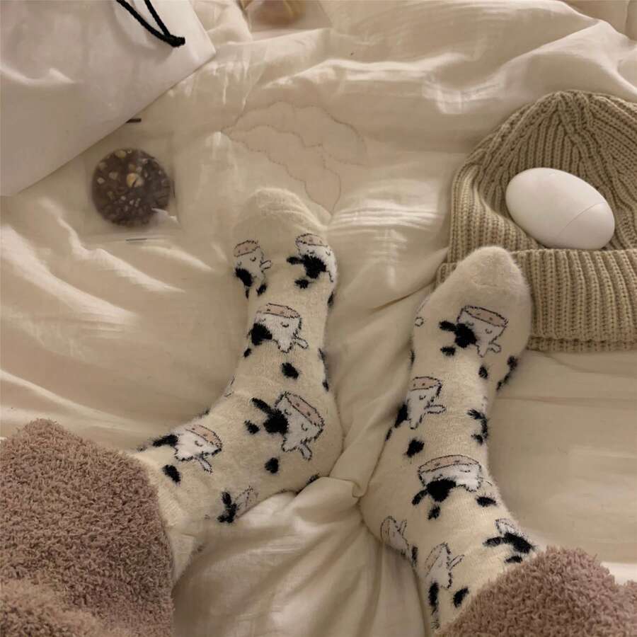 1pair Women's Thickened & Warm & Adorable & Fluffy Floor Sleep Mid-tube Socks With Cow And Mink Cashmere For Autumn And Winter