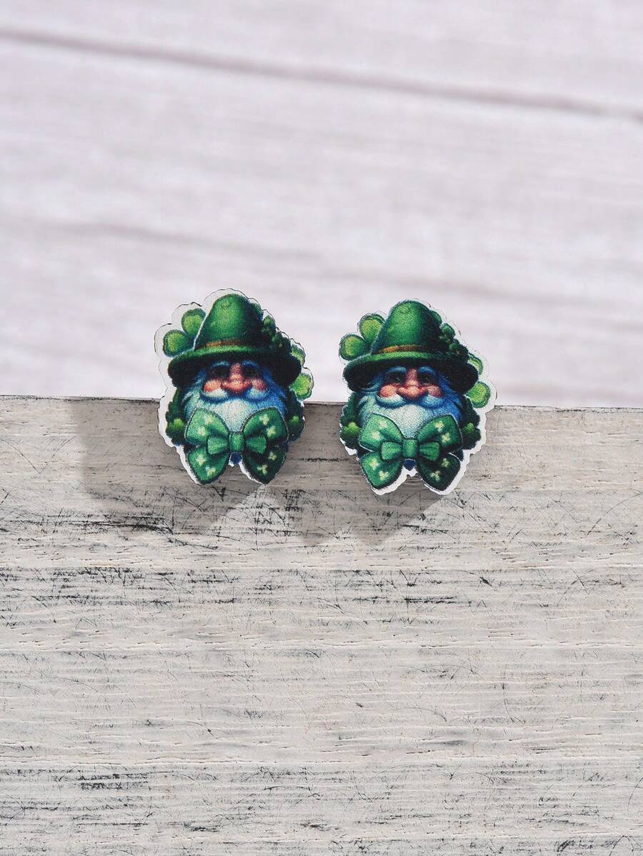 1pair Wooden Dwarf & Clover Leaf Shaped Ear Studs, St. Patrick'S Day Themed, Creative Versatile Chic Jewelry For Women, Party Holiday Gifts