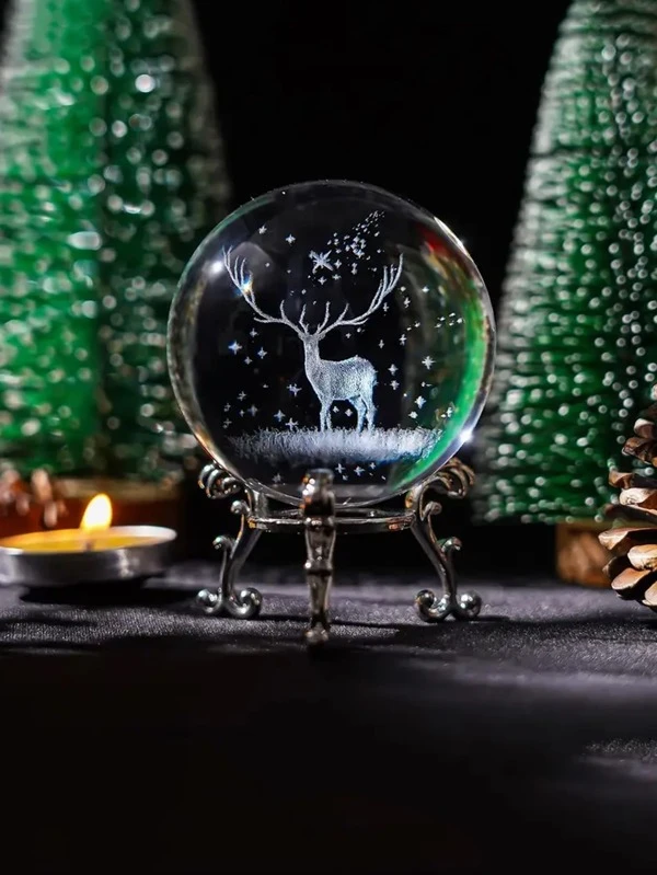 1pc, 2.4inch(60mm) 3D Inner Carving Christmas Deer Crystal Ball Paperweight Glass Sphere Laser Engraved Ball With Sliver-Plated Flowering Stand Home Art Decor