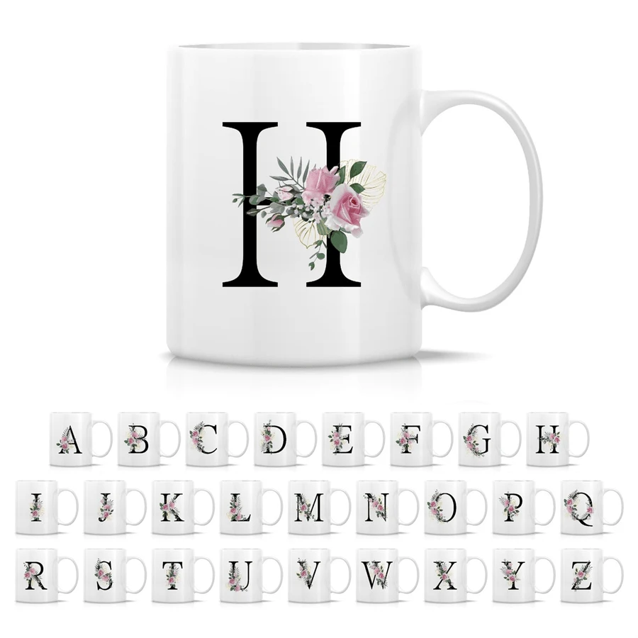 1pc, Letter Flower A-Z Coffee Mug For Office And Home, Alphabet Ceramic Coffee Mug, Birthday Gifts For Women, Mom, Best Friend, Bride, Bridesmaid Gift, White Tea Cup, Thanksgiving / Christmas Gift (11oz)
