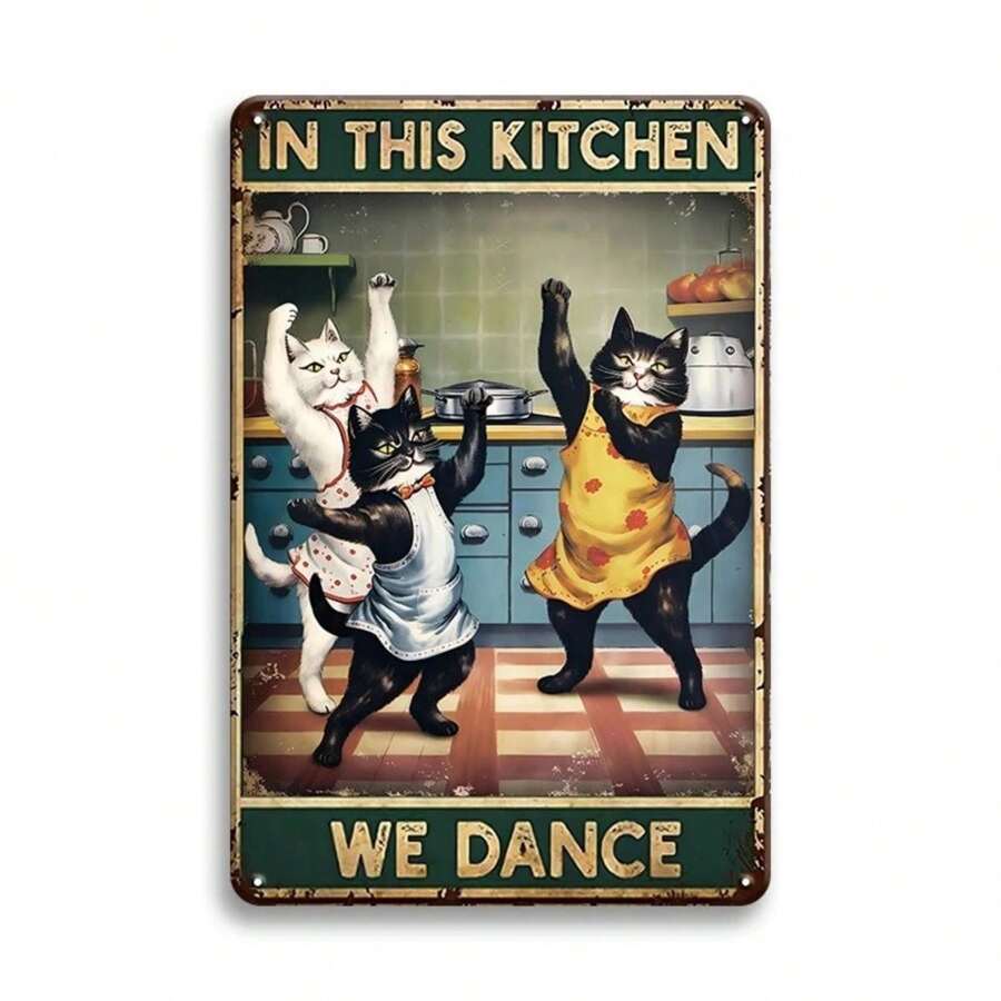 1pc 12x8 inches Tin Sign Funny Cat, In This Kitchen We Dance" Vintage Poster, Love Cooking Vintage Poster, Love Cat Vintage Poster, Cat Cooking Lovers Gift, Funny Retro Kitchen Metal Sign