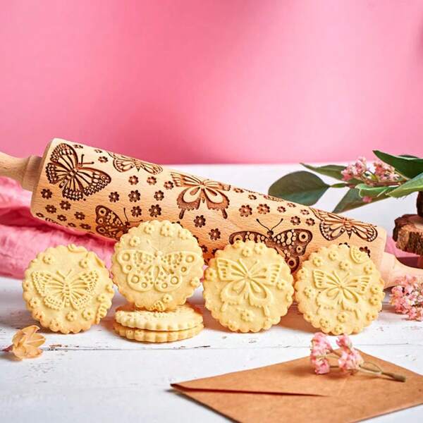 1pc 13.7inch Butterfly & Flower Pattern Wooden Rolling Pin, Suitable For Cookies, Biscuits, Festival Gifts