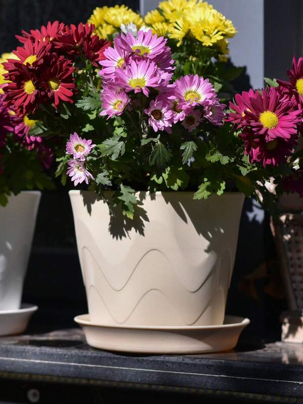 1pc 17.5*14.5cm Hexagonal Plastic Flower Pot And Round Tray Set Mini Desk Succulent Planter White, Beige, Dark Grey, Brick Red Suitable For Office Balcony Desk