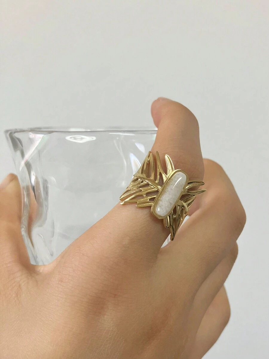 1pc 18k European And American Style Retro Stainless Steel Leaf Oval Glass Stone Ring, Suitable For Both Men And Women, Party Gift, Travel Accessory
