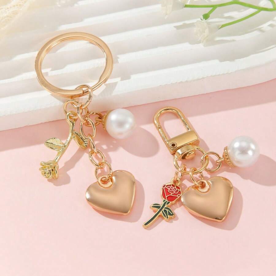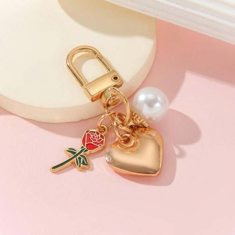 1pc 2024 Creative New Heart-Shaped & Peach-Shaped Keychain With Simple And Trendy Metallic Rose Flower & Pearl Charm As Friend Souvenir Gift. Can Be Used As Bag Pendant